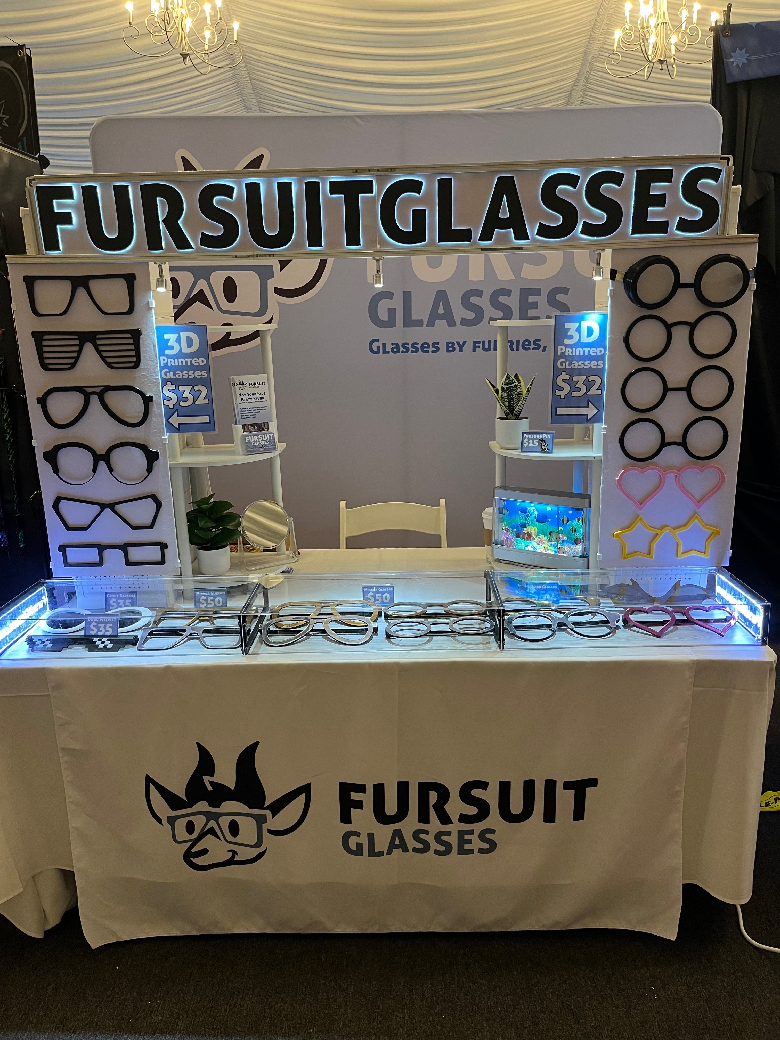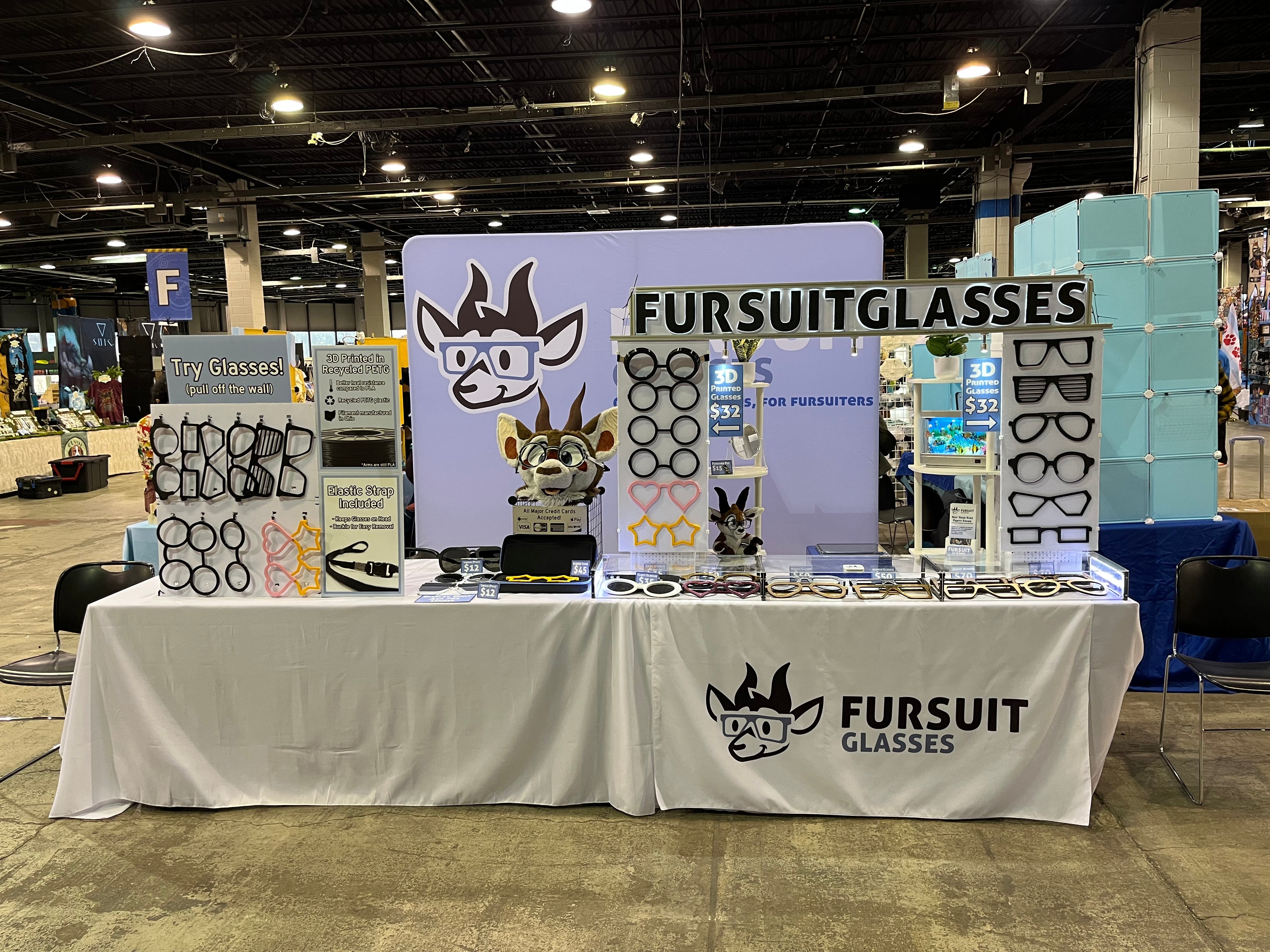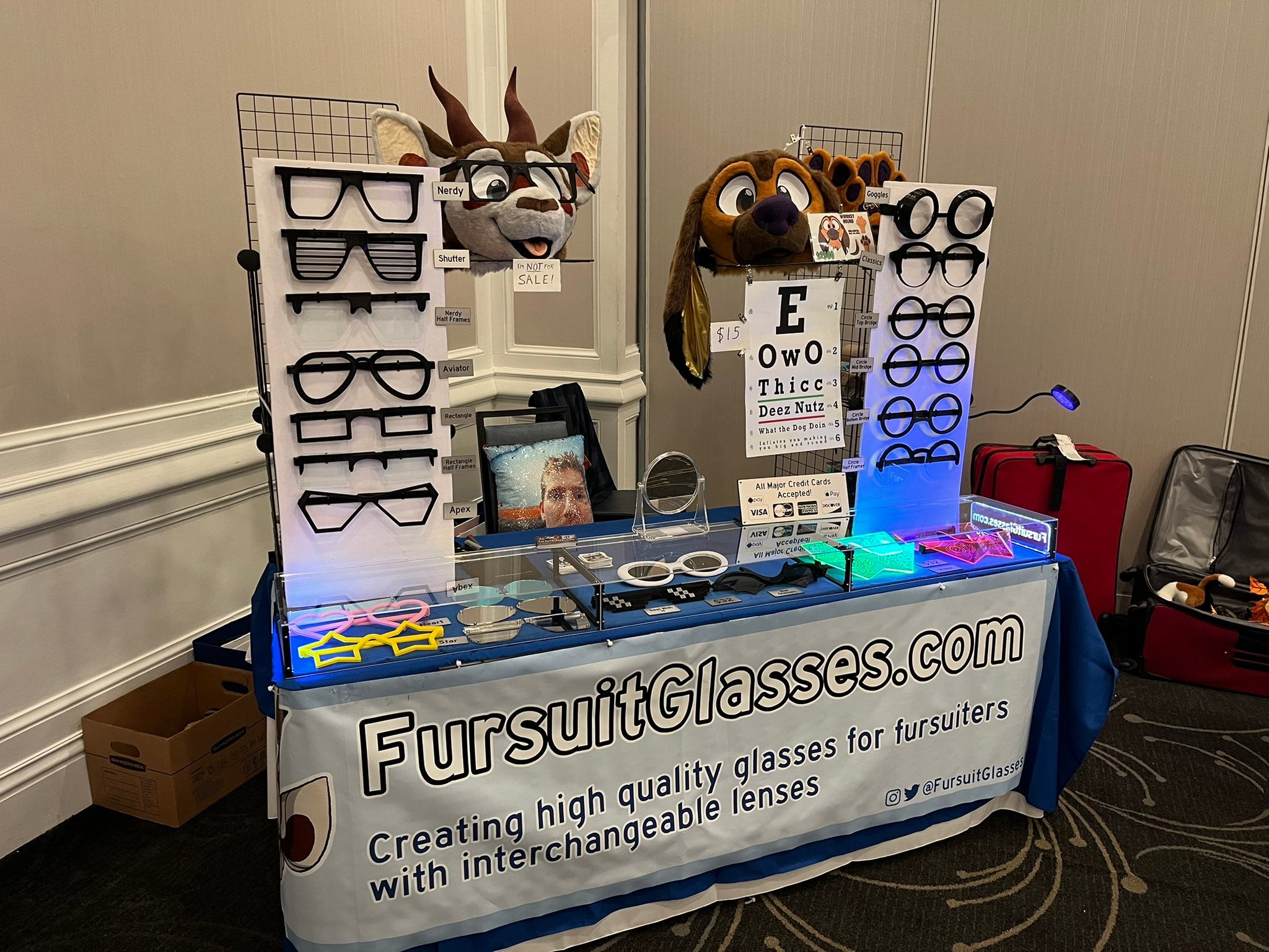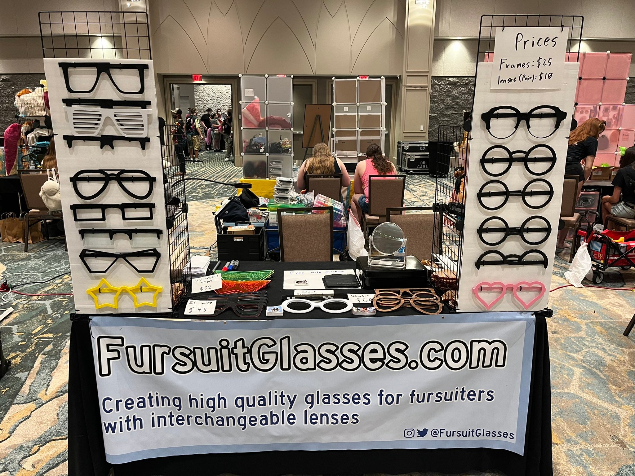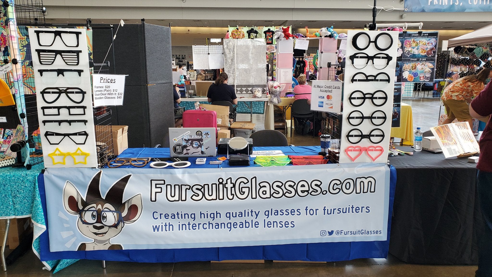 We do our best to create a booth experience like no other. Our booth is inspired from an optometrist office, with the traditional glasses displays and tidy welcoming atmosphere. We started in 2021, and we have since made improvements to get our booth and products to reflect the eye doctor experience.