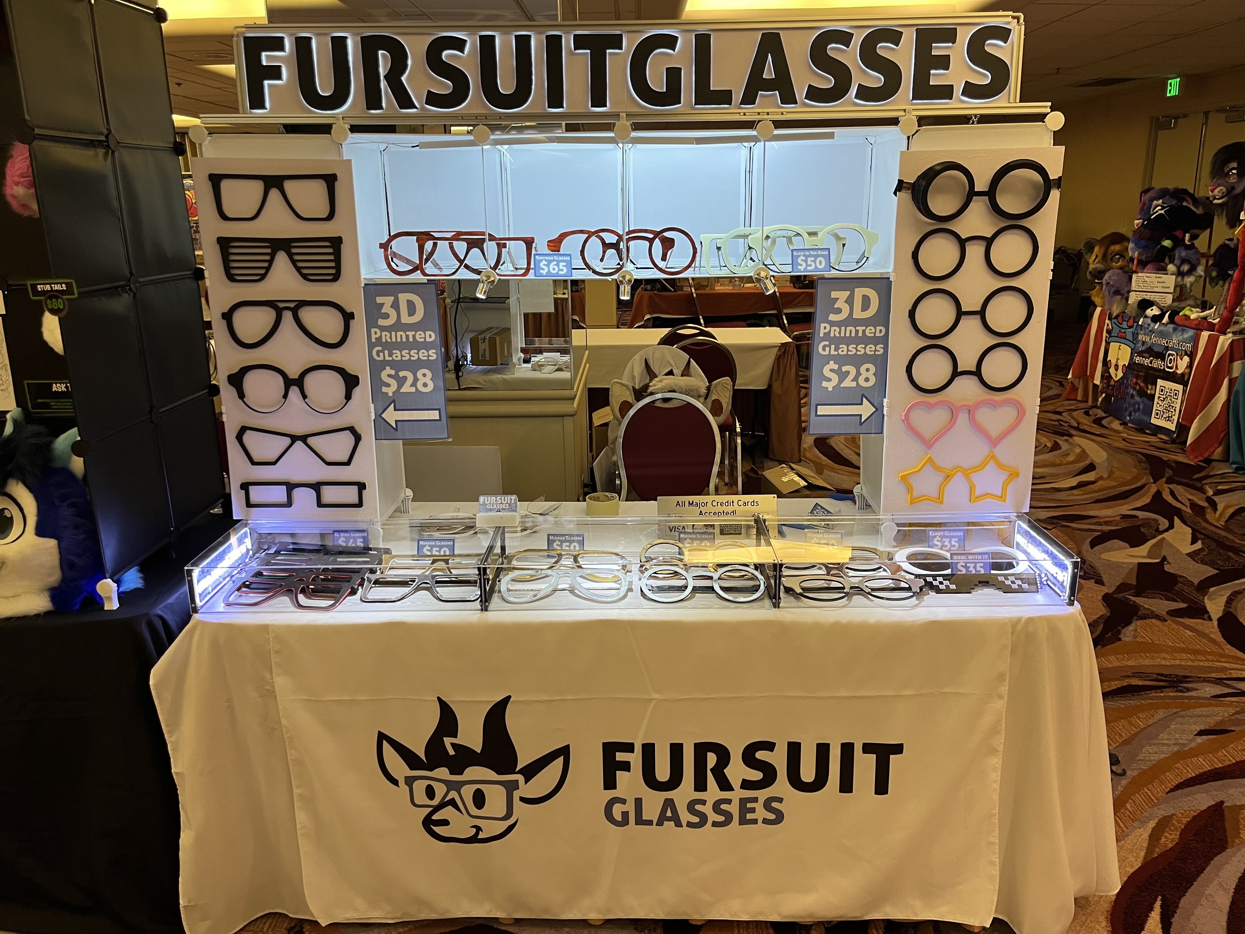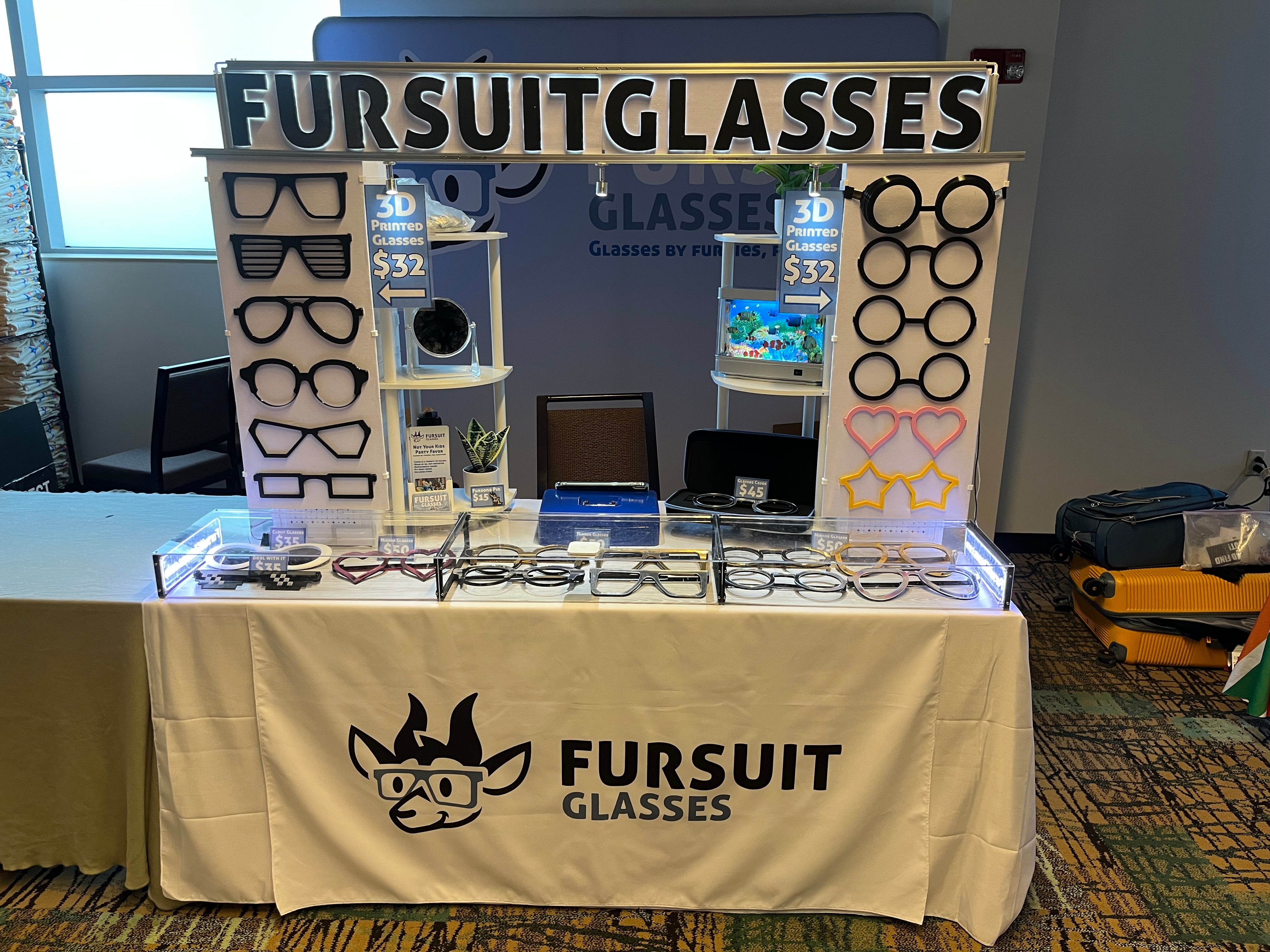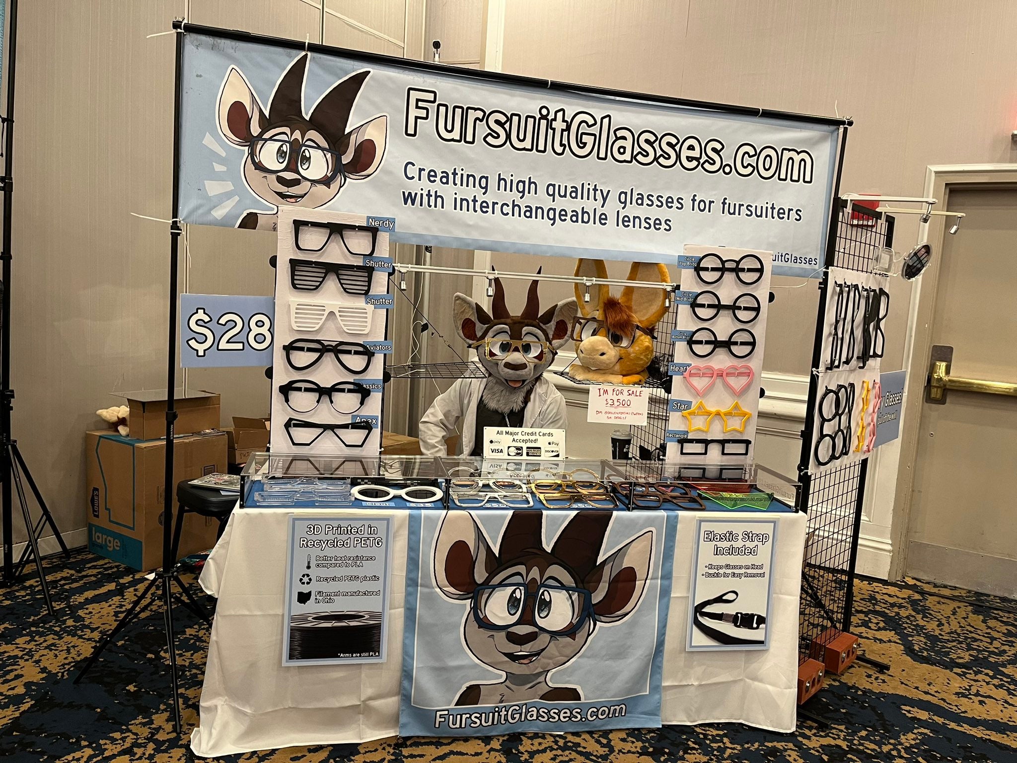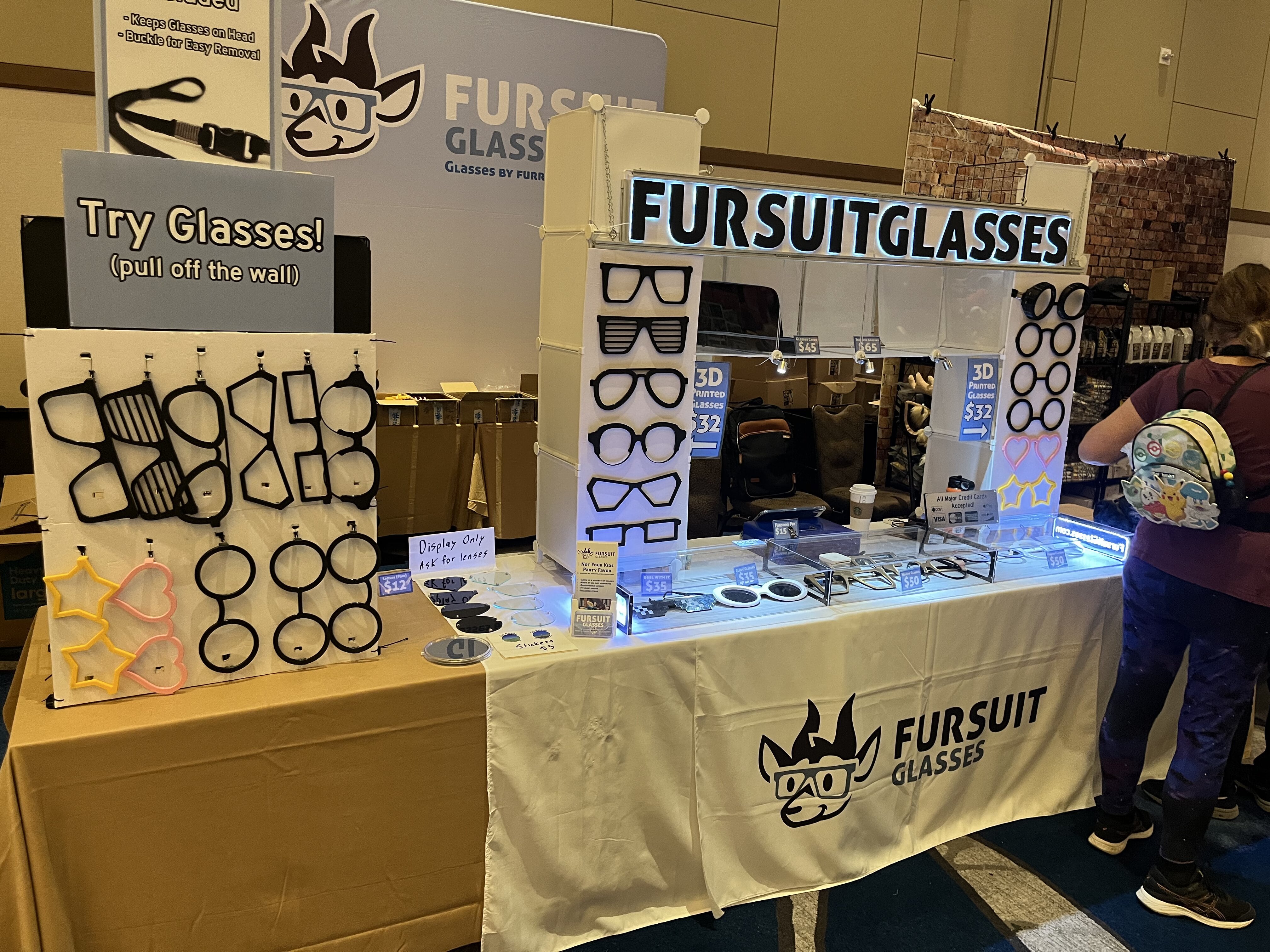 We do our best to create a booth experience like no other. Our booth is inspired from an optometrist office, with the traditional glasses displays and tidy welcoming atmosphere. We started in 2021, and we have since made improvements to get our booth and products to reflect the eye doctor experience.